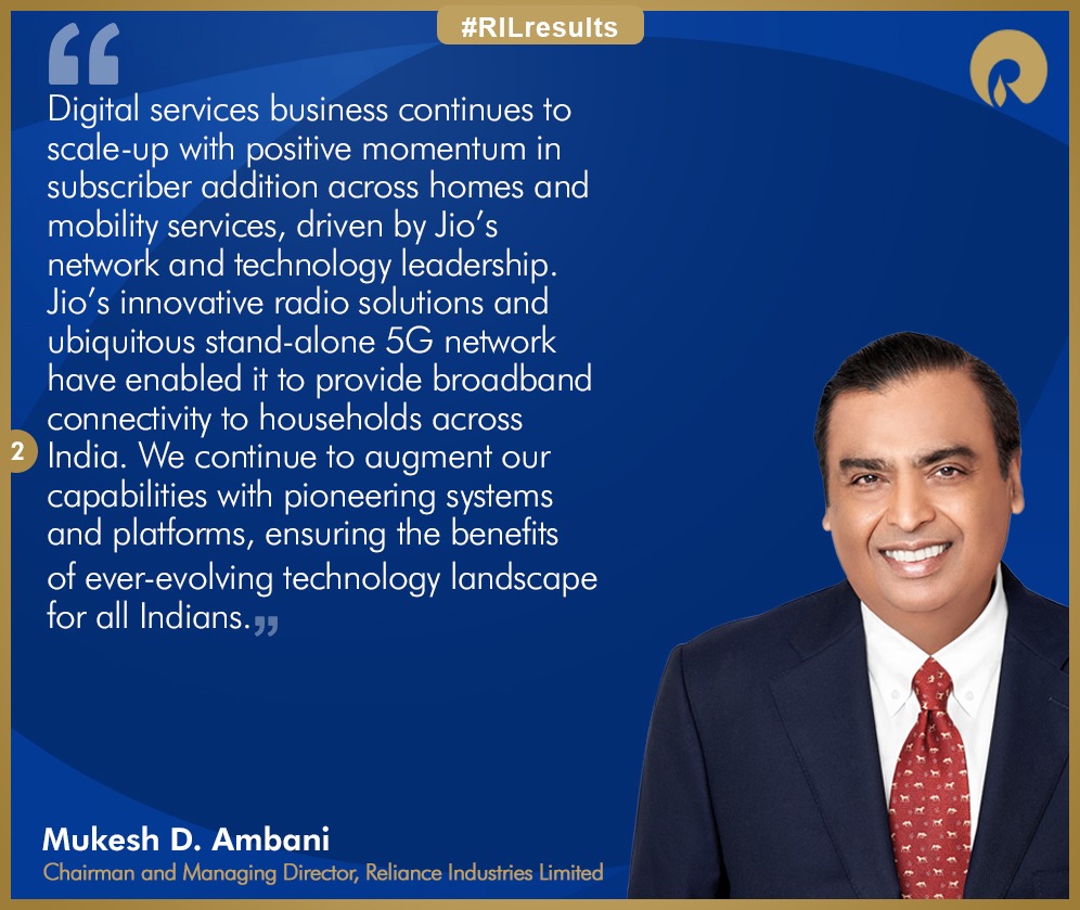 EBITDA এবং PAT স্তর জুড়ে দ্বি-অঙ্কের প্রবৃদ্ধি সহ শক্তিশালী একীভূত কর্মক্ষমতা। O2C, ডিজিটাল পরিষেবা এবং খুচরা ব্যবসায় উল্লেখযোগ্য প্রবৃদ্ধি।